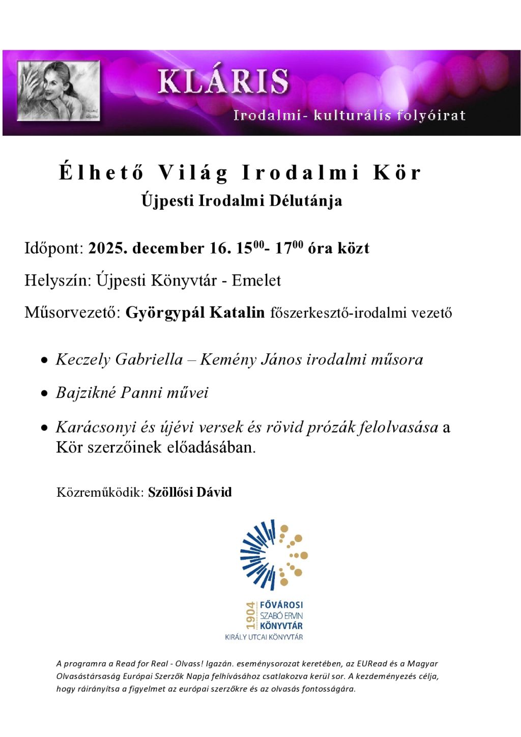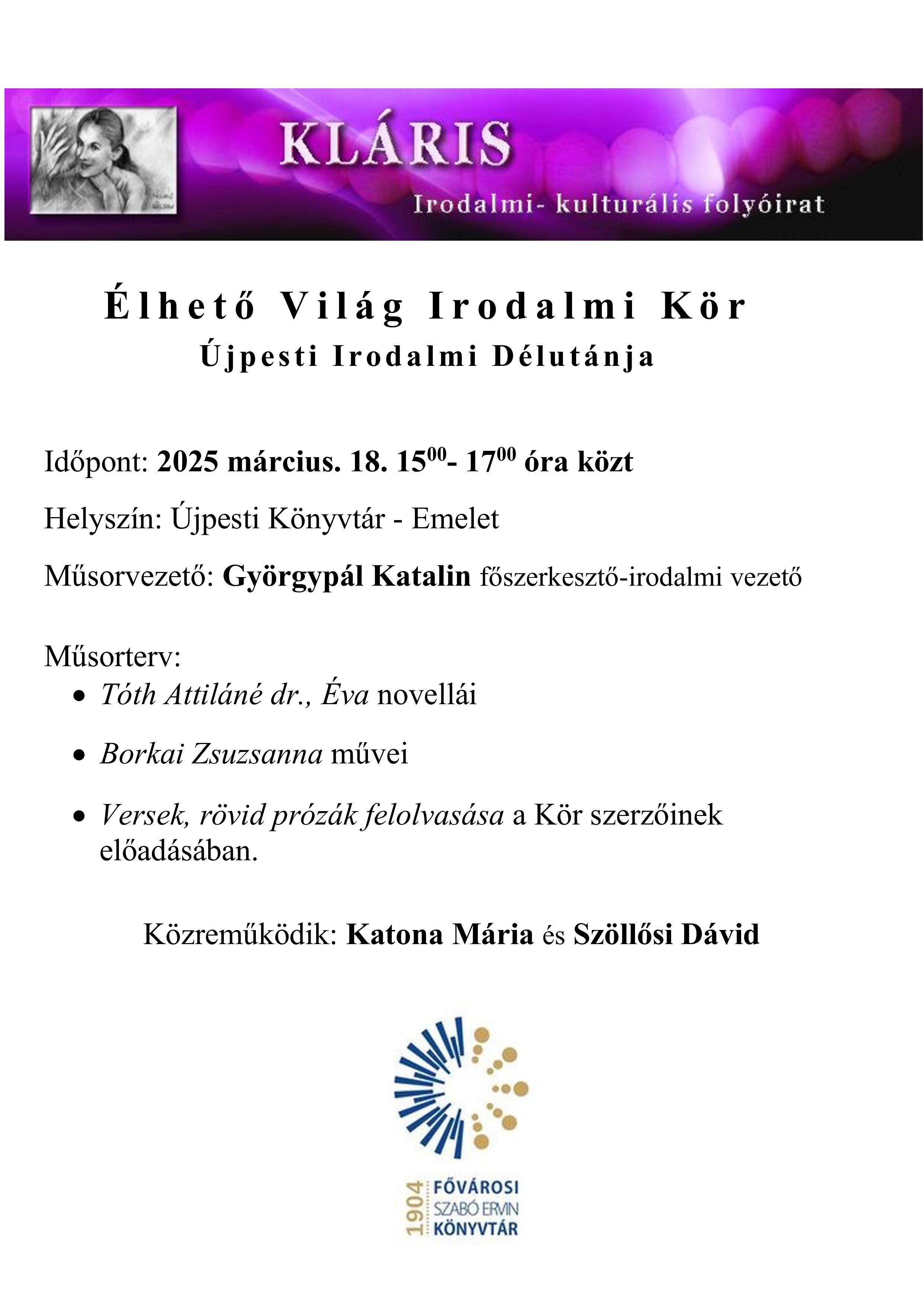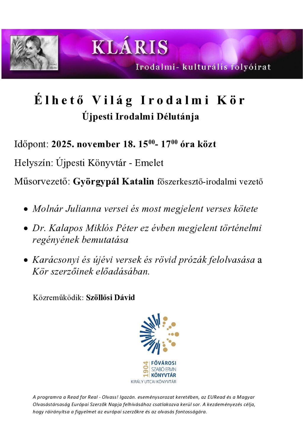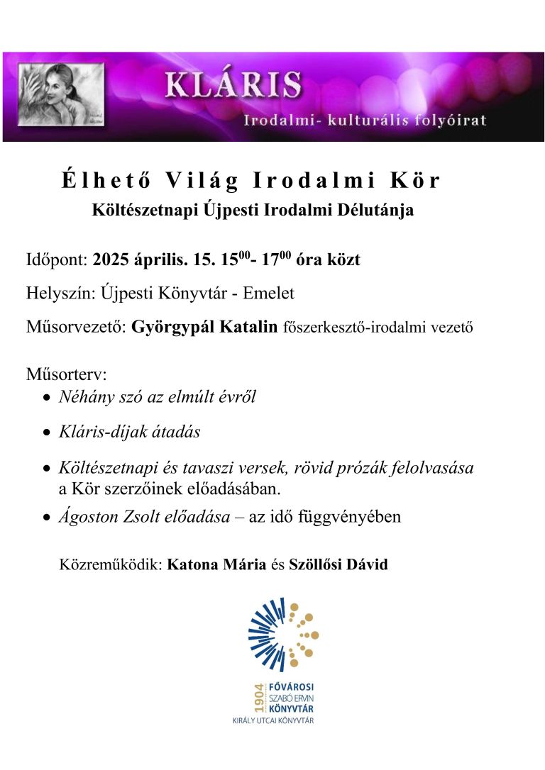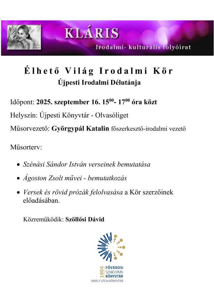 Az Élhető Világ Irodalmi Kör rendezvénysorozata az Újpesti Könyvtárban.