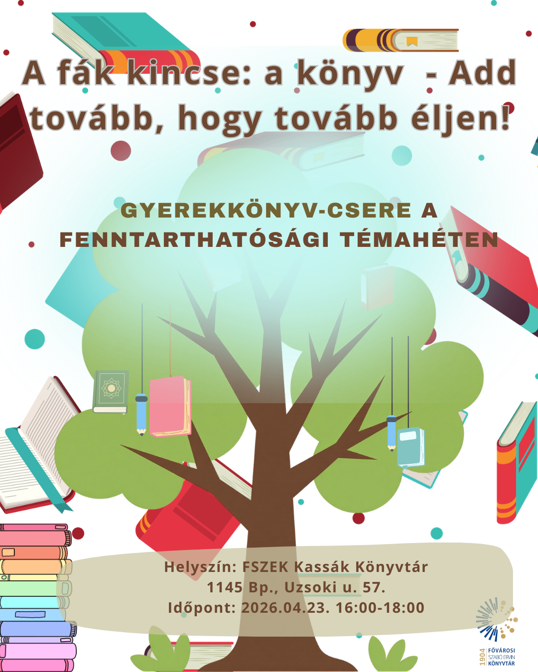 A Fővárosi Szabó Ervin Könyvtár Kassák Könyvtára szeretettel várja a szülőket és gyermekeiket a Fenntarthatósági Témahét keretében megrendezésre kerülő közösségi könyvcsere-délutánra. Az esemény célja, hogy a már kiolvasott, jó állapotú mesekönyvek új életre keljenek egy másik családban, ezzel is népszerűsítve a fenntartható szemléletmódot és a környezettudatos könyvhasználatot.
