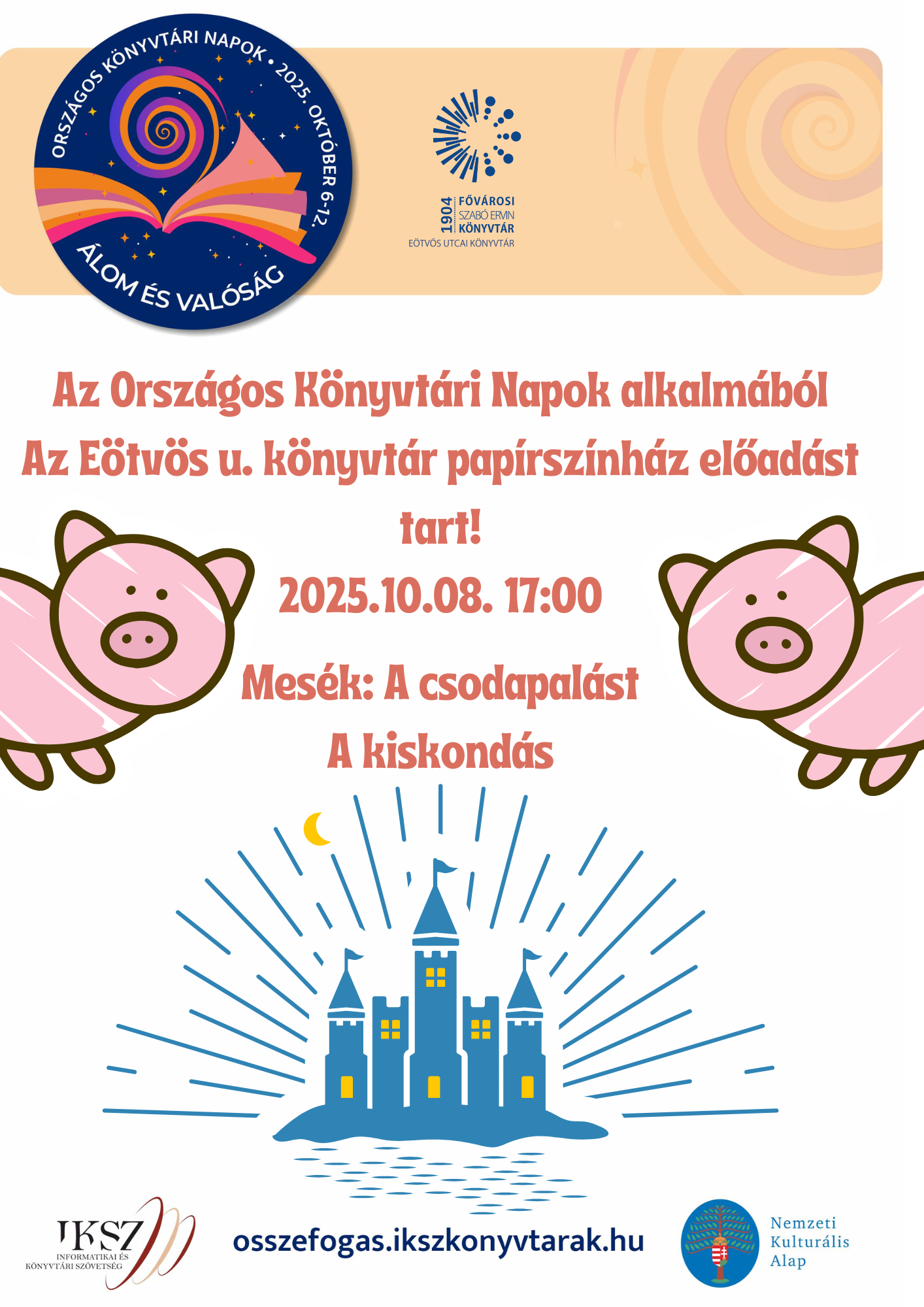Az OKN alkalmából ebben az évben is két mesével készülünk. A kicsiknek tartott papírszínház előadáson elhangzó történetek: a Csodapalást és a Kiskondás. Utána pedig közösen dolgozzák fel a történeteket kreatív és fantáziát megmozgató kérdésekkel, a könyvtárossal. A foglalkozást tartja Mihályi Adrienn, könyvtáros.