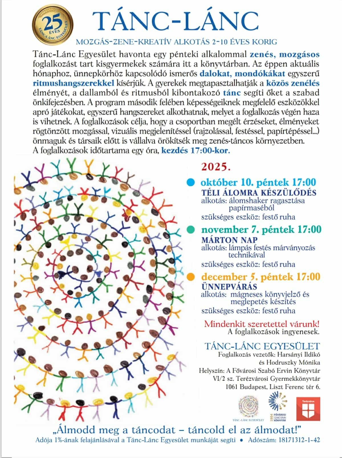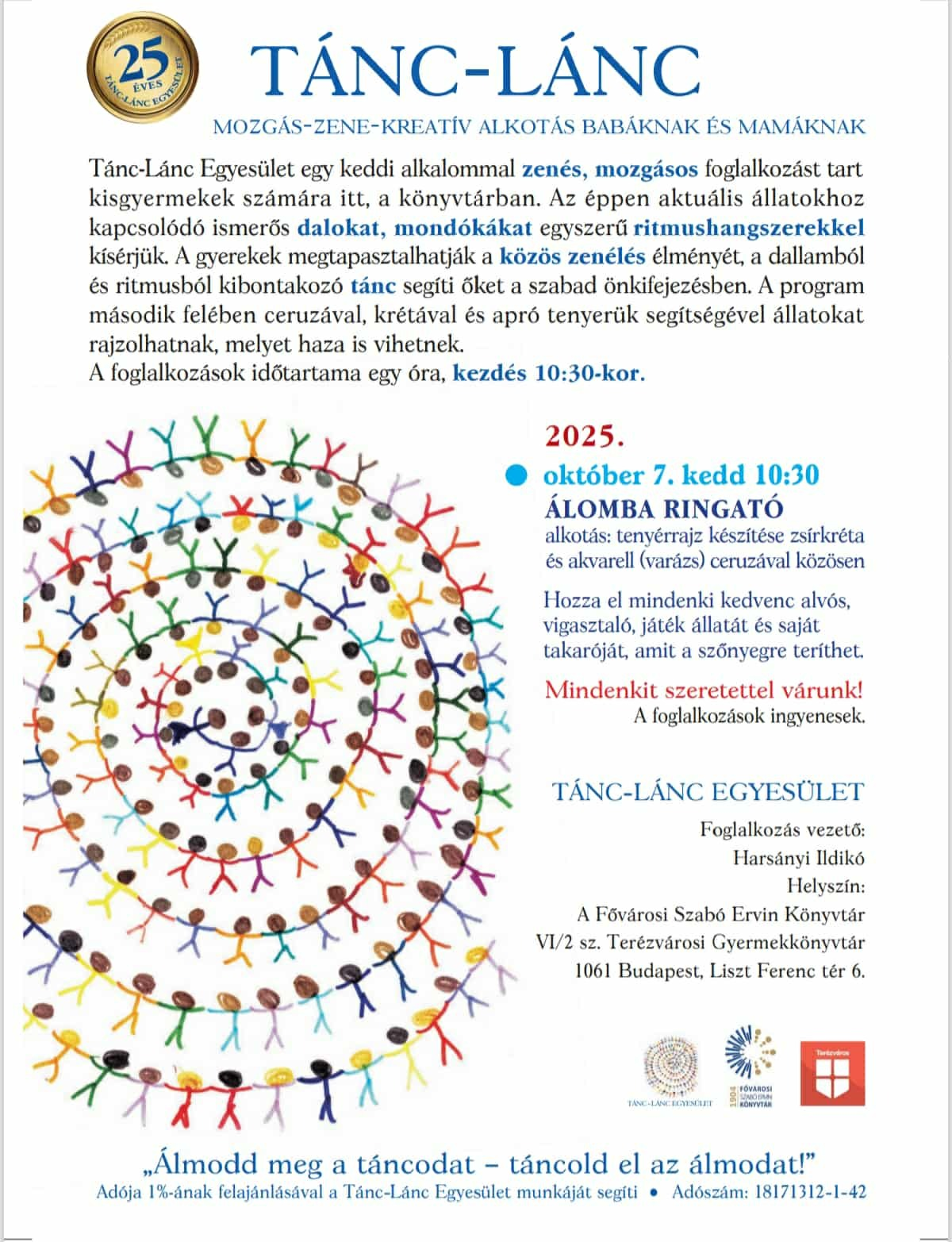 A fenti alkalmakkal az Országos Könyvtári Napok keretén belül ünnepeljük a Tánc-Lánc Egyesület 25. születésnapját.