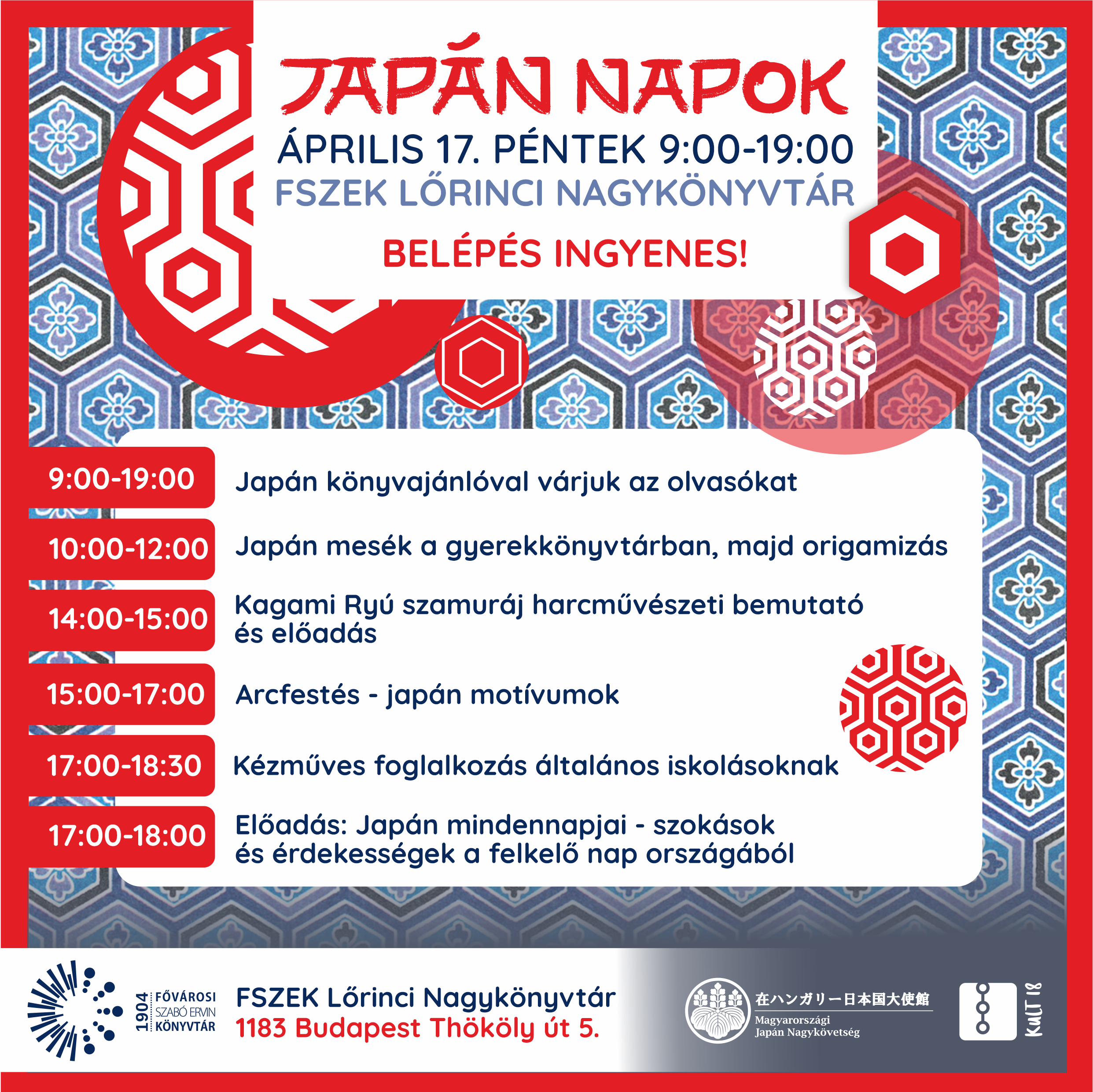 A Japán Napok rendezvény a Magyarországi Japán Nagykövetség / Embassy of Japan in Hungary támogatásával, a Kondor Béla Közösségi Ház és Intézményei (Kult18) és a Lőrinci Nagykönyvtár közös szervezésében valósul meg.