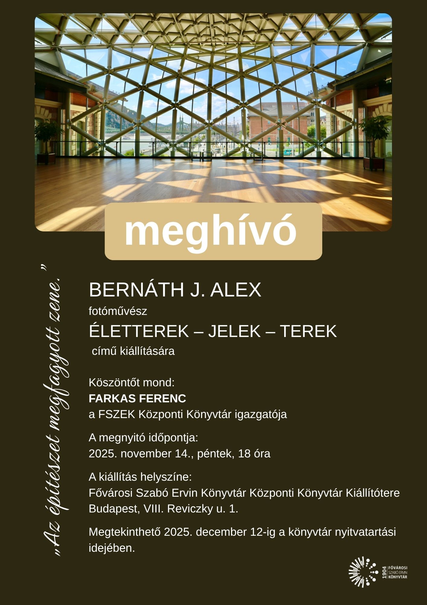 A Fővárosi Szabó Ervin könyvtár szeretettel meghívja Önt és ismerőseit Bernáth J. Alex Életterek – Jelek – Terek című kiállításának megnyitójára.
