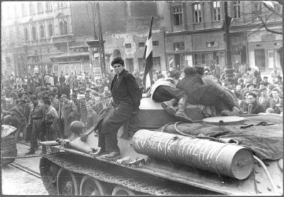 "Ruszkik haza!" Felirat egy tankon a József körúton 1956. október 28. Nagy József felvétele Azonosító: 056116 |