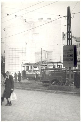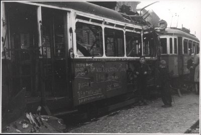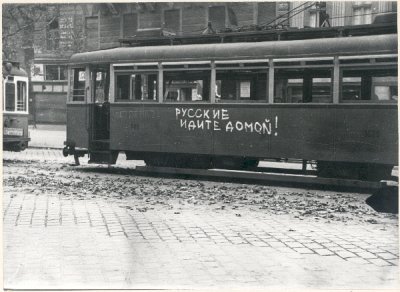 "Ruszkije igyitye domoj!" Felirat egy villamoson, valószínűleg a Rákóczi úton 1956. október 28. Nagy József felvétele Azonosító: 056261 |