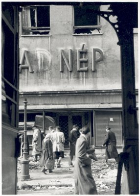 A a Blaha Lujza téri "Szabad Nép"-székház bejárati felirata "A Nép"-re átalakítva 1956 Azonosító:056323 |