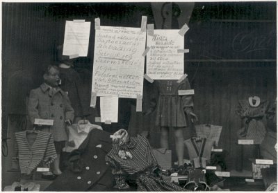 "Nem dolgozunk, csak kármentesítünk!" Felirat a Rákóczi úti Verseny Áruház kirakatában 1956 Azonosító:056312 |
