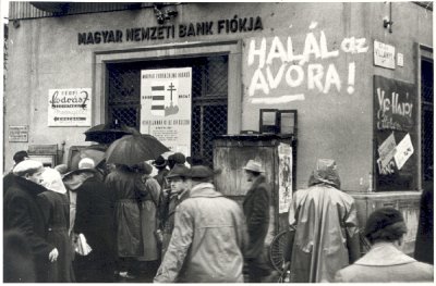 "HALÁL az ÁVÓRA!" Felirat és a Magyar forradalmi híradó plakátja a Móricz Zsigmond körtér és Villányi út sarkán 1956 Azonosító: 056479 |
