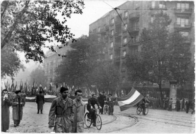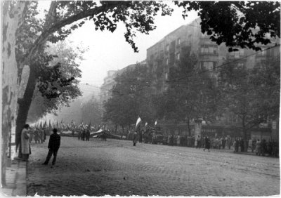 Az ún. véres zászlós tüntetés a Belvárosban 1956. október 25. Nagy József felvétele Azonosító: 056046 |