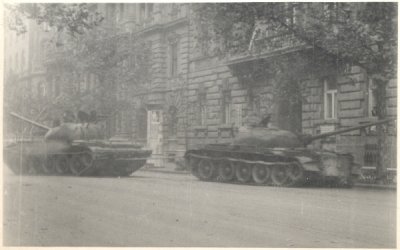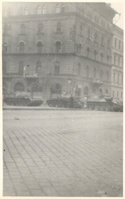 Tankok az Alkotmány utca és a Bajcsy-Zsilinszky körút sarkán 1956 Benedek István felvétele Azonosító: 056522 |