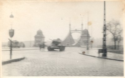 Szovjet tankok a Szabadság híd pesti hídfőjénél. 1956. nov 4. után (?) Benedek István felvétele Azonosító: 056467 |