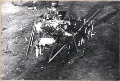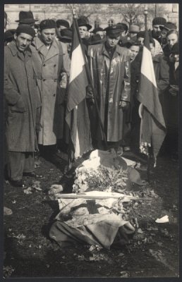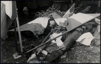 Elesett ostromló zászlókkal leborított holtteste (?), háttérben kivégzett ÁVH-s katona a Köztársaság téren 1956. október 30. Azonosító: 056355 |