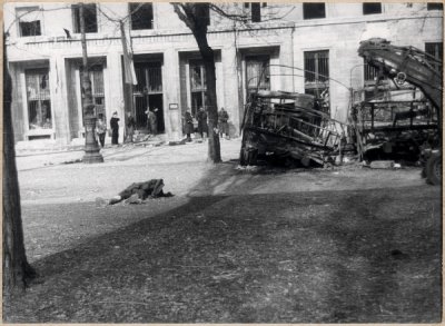 Kivégzett ÁVH-s katona, autóroncsok a Köztársaság téren 1956. október 30. Azonosító: 056412 |