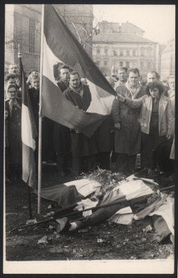 Elesett ostromlók zászlókkal leborított holtteste a Köztársaság téren 1956. október 30. Eötvös Gyula felvétele Azonosító: 056550 |