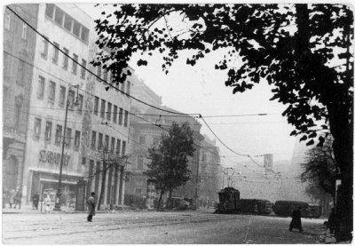 Villamos- és teherautóroncsok a Szabad Nép-székháznál 1956. október 25. Nagy József felvétele Azonosító: 056011 |