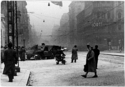 A kép felirata szerint "Szovjet tankok szétverik a tüntetőket" . Ha az emlékezés pontos, akkor a felvétel az MSZMP melletti tüntetés kapcsán kirobbant összetűzésekkor készült 1956. december 6. Nagy József felvétele Azonosító: 056036 |