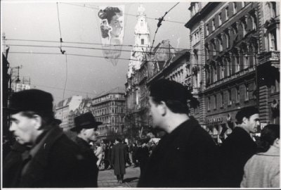 A kép felirata szerint: "Tüntetők a Himnuszt éneklik a Körút-Rákóczi út kereszteződésében". Ha az emlékezés pontos, akkor a felvétel az MSZMP melletti tüntetés kapcsán kirobbant összetűzésekkor készült 1956. december 6. Nagy József felvétele Azonosító: 056035 |