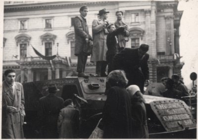 Egy páncélkocsi roncsán a Nemzeti Színház mögött 1956 Benedek István felvétele Azonosító: 056583 |
