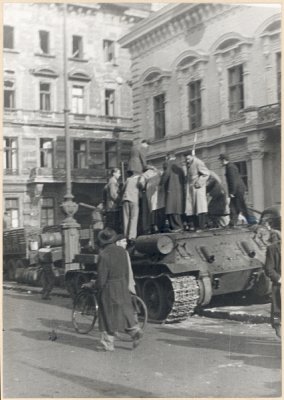 T-34/86-os tank a Pollack Mihály téren a Nemzeti Múzeum mögött 1956. okt 25. Azonosító: 056327 |