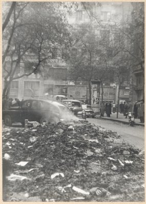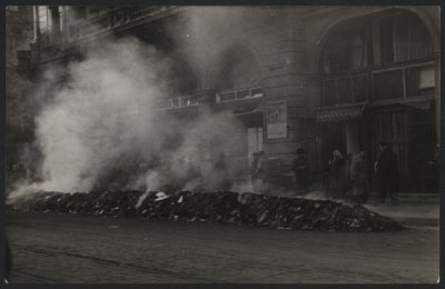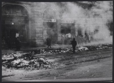 Füstölgő könyvhalmok a Kossuth Lajos utcai Horizont (szovjet) könyvesbolt előtt 1956. október 26. körül Eötvös Gyula felvétele Azonosító: 056562 |