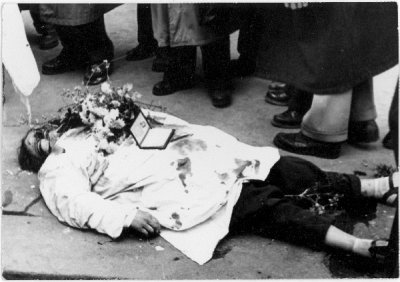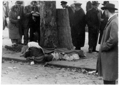 Halott magyar ápolónővér a Rákóczi úton 1956. október 25. Nagy József felvétele Azonosító: 056009 |