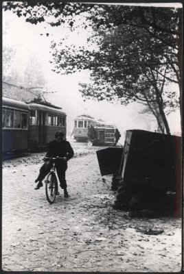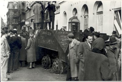 "Ruszkik haza!" Felirat egy villamoson, valószínűleg a Rákóczi úton 1956. október 28. Nagy József felvétele Azonosító: 056635 |
