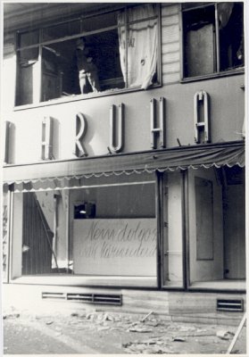 Romos üzlet valószínűleg a Rákóczi úton 1956. október 25. Nagy József felvétele Azonosító: 056019 |