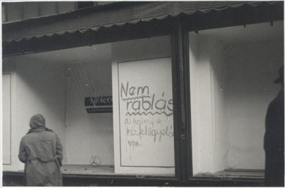 "Nem dolgozunk, csak kármentesítünk!" Felirat a Rákóczi úti Verseny Áruház kirakatában 1956 Azonosító:056312 |