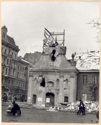 A romos Rókus kápolna a Rákóczi úton 1956. november 12. Nagy József felvétele Azonosító: 056015 |