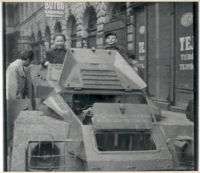 Gyerekek játszanak egy roncskocsin az Akácfa utcában 1956. október 28. Azonosító: 056365 |