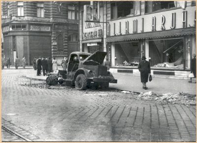 Egy GAZ-63A teherautó roncsa a Verseny Áruház előtt 1956 Azonosító:056394 |