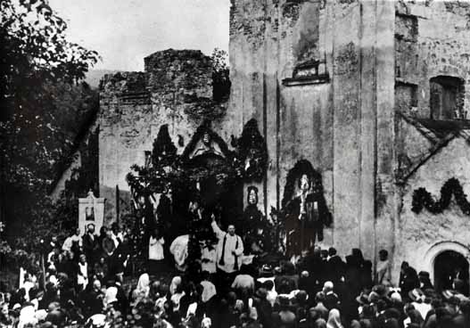 Zarándokok a Makkos Mária-kegytemplom romjainál, 1918. 1731-ben Traub János budakeszi legény csodás gyógyulása után hálából Mária-képet csináltatott, majd azt látomása helyén egy tölgyfára helyezte. A népszerűvé vált zarándokhelyen 1768-ban szentelték fel a trinitáriusok kolostorát. A rend feloszlatása után a templom is pusztulásnak indult, csak 1938-1947 között állították helyre.