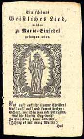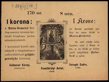 | Német nyelvű máriaremetei Mária-ének a 18. századból. | Téglajegy a máriaremetei templom újjáépítésére a 19. század végén. 1763-ban a Svájcból bevándorolt Thalwieser Katalin a pesthidegkúti erdőben egy fára erősítette a magával hozott, az einsiedelni Boldogasszony-kép nyomán készült másolatát; hamarosan ehhez a festményhez is csodák kapcsolódtak, és megkezdődtek a zarándoklatok. A népszerű búcsújáróhely 1808-ban felszentelt, kicsinek bizonyuló kápolnája helyén 1899-ben adták át a mai templomot. | |||||||||||||||||