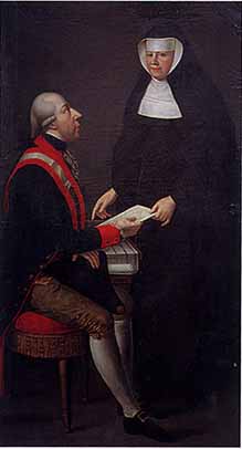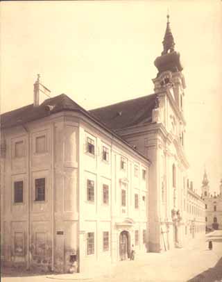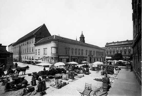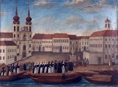 Az Erzsébet-apácák megérkeznek Budára, 1785. A Felső piac téren (Batthyány tér) még látható a pestisoszlop, amely 1828 óta - többször újrafaragva - ma a Mária teret ékesíti.