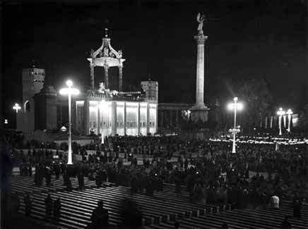 Az Eucharisztikus Világkongresszusra feldíszített Hősök tere esti díszkivilágításban, 1938.