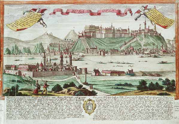 A számokkal jelzett épületek: 1. Invalidus-ház. 2. Ferences templom. 3. Régi török mecset. 4. Pálos templom. 5. Szervita templom. 6. Domonkos rendi templom. 7. Várostorony. 8. Plébániatemplom. 9. Sóház. 10. Repülőhíd. 11. Királyfürdő. 12. Rácfürdő. 13. Óhitű (görögkeleti) templom. 14. Plébániatemplom. 15. Rác kapu. 16. Gellért-hegy 17. Erődítmény. 18. Fegyvertár. 19. Kaszárnya. 20. Karmelita templom. 21. Vízi kapu. 22. Városháza. 23. Jezsuita kollégium. 24. Postaház. 25. Élelemraktár. 26. Ferencesek. 27. Kapucinusok. 28. Jezsuiták háza. 29. Ferencesek. 30. Temetőkápolna. 32.[!] Török mecset.