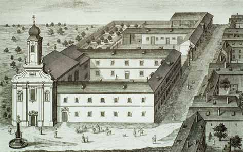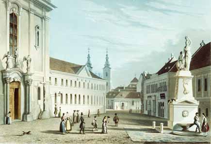 A szerviták temploma és rendháza a mai Petőfi Sándor utca végén, illetve a Szervita téren 1740 körül. A szerviták feladatai közé tartozott a szomszédos Invalidus-házban élő hadastyánok lelki gondozása. A templom előtt álló Mária-szobor felállítását (1729) a városi tanács kötötte ki annak fejében, hogy a rend panaszának eleget téve megszabadította őket egy kovácsműhely kellemetlen szomszédságától.