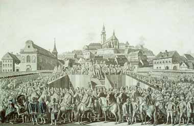 I. Ferenc koronázási esküje 1792. június 6-án. Balra a kapucinusok kolostora, háttérben a Nagyboldogasszony- (Mátyás-) templom. A kapucinusok - a vízivárosi polgárok lelki gondozása mellett - több tucatnyi, a törökök kiverése után lelkipásztor nélkül maradt városkörnyéki faluban gondoskodtak a papi teendők ellátásáról.