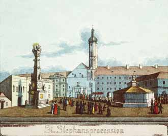 Körmenet a budai Szentháromság-téren a 19. század elején. A 18. században számtalan nyilvános könyörgésnek és színpompás hálaünnepnek volt színtere a tér.
